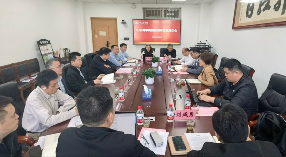 On March 25, Zhang Liang, Deputy Director of the Shandong Maritime Safety Administration, and his team visited the academy for a special discussion session on the development of the senior crew training 'Ten-Hundred-Thousand' talent project. Vice President Zhang Di attended the discussion. Zhang Ling, Director of the Crew Examination Center of the Yangtze River Maritime Bureau, Gan Zhiping, Vice Dean of the School of Undergraduate, Liu Kezhong, Dean of the School of Navigation, Zhang Jinfeng, Vice Dean of the School of Navigation, Hu Huanan, Vice Dean of the School of Naval Architecture, Ocean and Energy Power Engineering, Lin Hui, Dean of the Qingdao Research Institute, and representatives from the navigation technology department participated in the event.